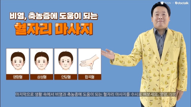 비염과 축농증에 도움이 되는 경혈 마사지를 수시로 해보세요.영향, 윗목, 린탄, 합곡 등의 경혈을 가볍게 누르거나 주위를 부드럽게 마사지하여 자극해 주면 증상을 개선하는 효과가 있습니다.