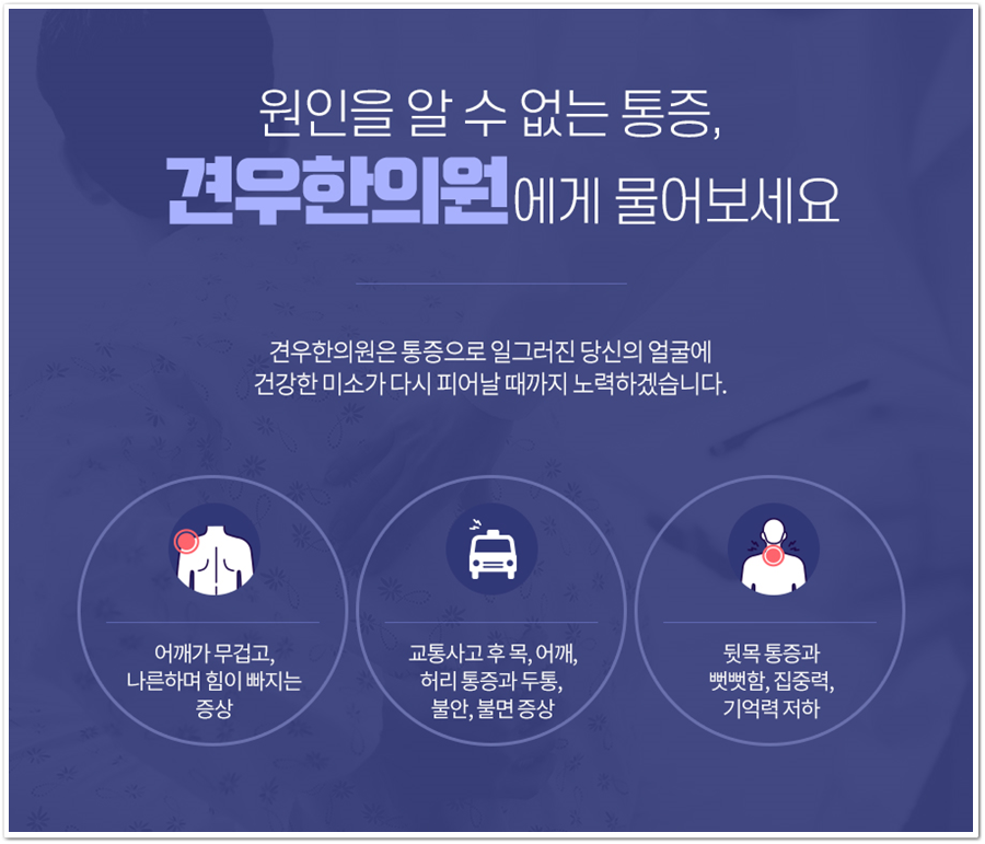 근막통증이 나타나면 근육에 방사통을 유발하는 이유가 되는 통증 유발점을 발견한 후 개선해야 일상생활을 정상적으로 영위할 수 있습니다. 중구한의원에서는 몇 가지 한방요법을 활용하여 근막통증으로 인해 생긴 흉통을 개선할 수 있도록 돕고 있습니다.
