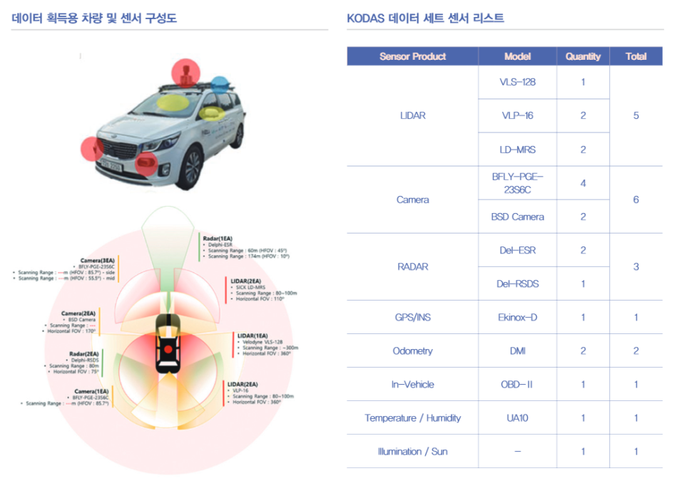 차량의 탑재 센서는 #환경인식센서 5종 16개와 #위치인식센서 3종 4개로 구성되어 있습니다. 환경인식센서는 #LIDAR5대, #RADAR3대, 카메라6대, #온습도센서1대, #조도센서1대이며 위치인식센서는 GPS/INS, DMI, OBD-II 입니다. KODAS 데이터 셋 획득 시스템은 향후 센서의 확장성을 위해 분산식으로 구축하였습니다.