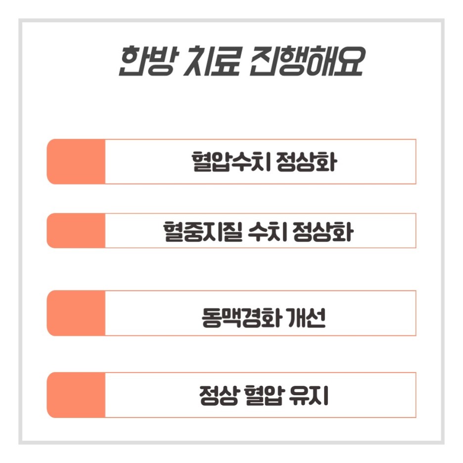 한약을 통해 혈압 수치를 정상화하고 혈압 상승으로 인한 증상들을 소실시키며 혈중지질 수치를 정상화하여 동맥경화 개선까지 돕고 있습니다.