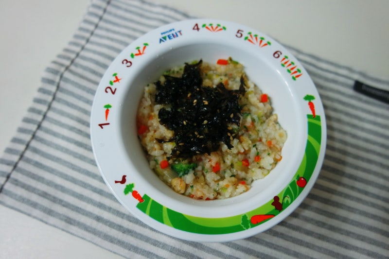 유아식 새우볶음밥 레시피(재료: 새우살 6마리 35g, 밥 90g, 당근 20g, 양파 20g, 애호박 20g, 무염버터 5g, 계란 1개 50g, 굴소스 1t, 참기름 1t, 깨) 1. 야채는 세척 후 잘게 다진다. 새우살을 세척한 후 물기제거 계란을 깨끗이 녹인다2. 팬에 기름을 두르고 파를 볶다가 야채볶음3. 버터를 녹여 새우볶음4. 달걀스크램블 만들기5. 밥과 굴소스를 넣고 볶는다6. 참기름으로 마무리