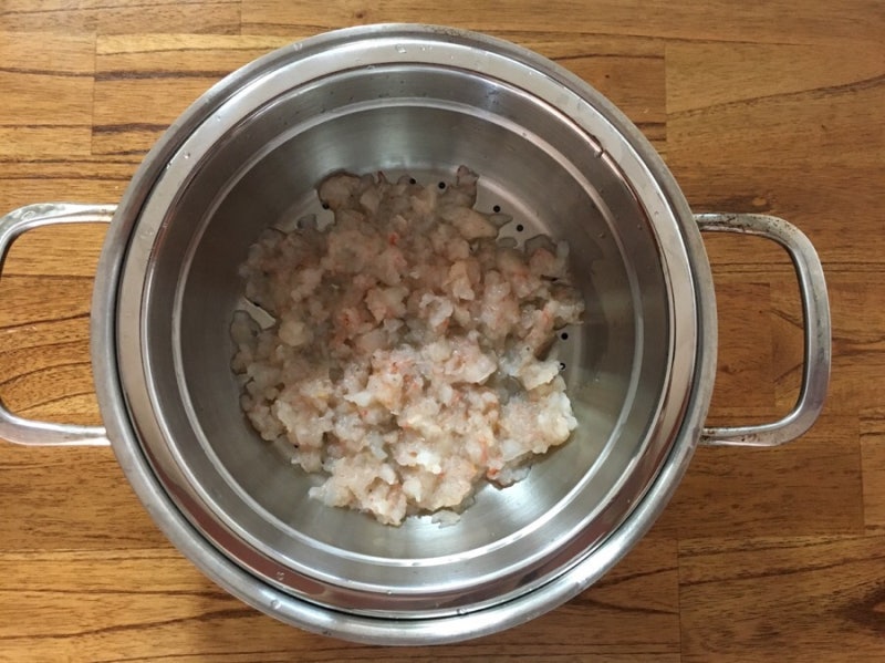 새우살은 냉장고에서 해동한 후 흐르는 물에 가볍게 씻고 물기를 제거합니다. TIP) 새우는 식품 알레르기 9번입니다.
