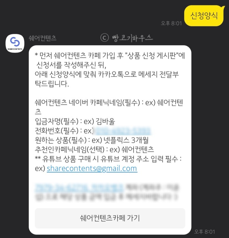 ▼쉐어콘텐츠 카카오 상담채널▼ 알뜰하게 OTT 서비스를 개시하십시오. 넷플릭스 와처 유튜브 TV를 국내 최저가로 제공합니다! pf.kakao.com ▼ 쉐어콘텐츠 공식 네이버카페 ▼▶ 국내 최저가 OTT 서비스(넷플릭스, 와처, 유튜브 프리미엄, 웨이브, 티빙) 계정 공유 서비스입니다.cafe.naver.com
