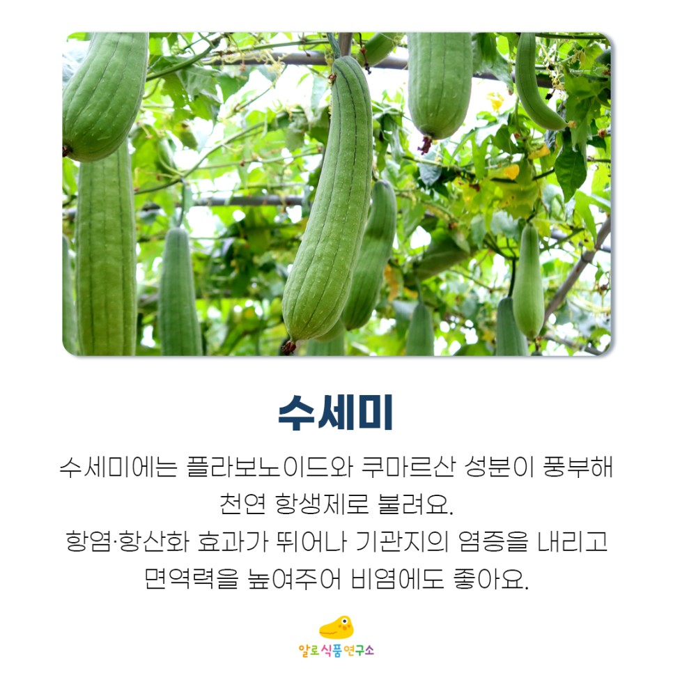 수세미에는 천연 항생제라고 불리는 플라보노이드와 쿠마르산 성분이 풍부합니다.항염·항산화 효과가 뛰어나 기관지 염증을 완화하고 면역력을 높여 비염에도 좋습니다.