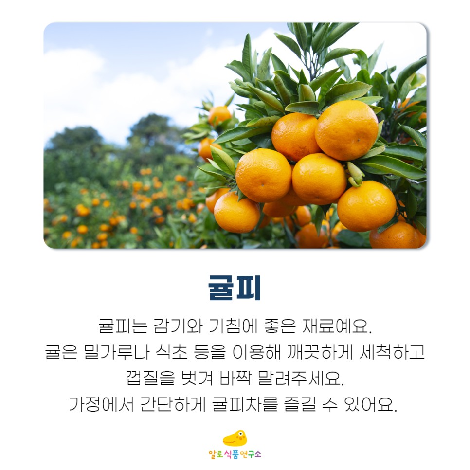 겨울에 귤 많이 드시죠?귤 껍질이 기침에 좋은 음식이라는 사실을 아세요?귤은 밀가루나 식초 등으로 깨끗이 씻고 껍질을 벗겨 잘게 썰어 말려주세요.뜨거운 물을 부어 가정에서도 귤차를 즐길 수 있습니다.