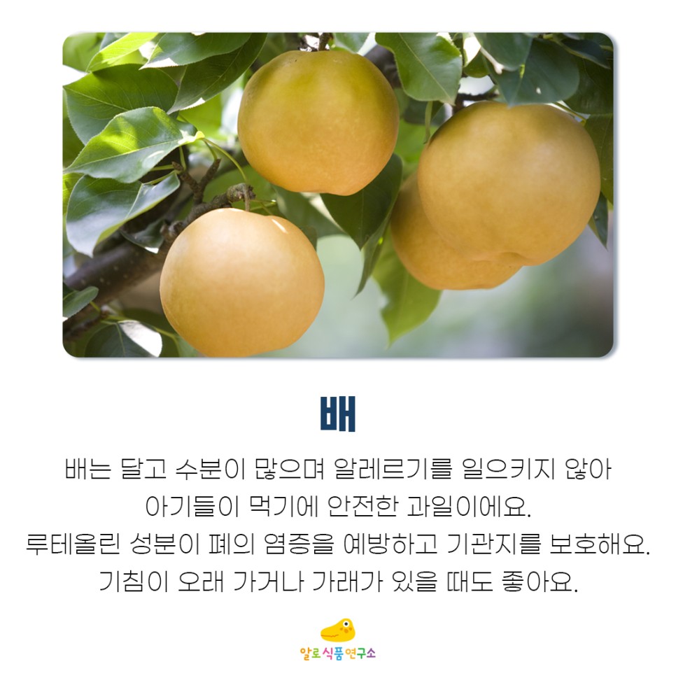 배는 달고 수분이 많고 알레르기를 일으키지 않아 아기가 먹기에 안전한 과일입니다.배에는 다양한 영양분이 들어있는데 특히 루테올린 성분이 폐의 염증을 예방하고 기관지를 보호합니다.아이의 기침이 오래 걸리거나 가래가 있을 때도 좋습니다.