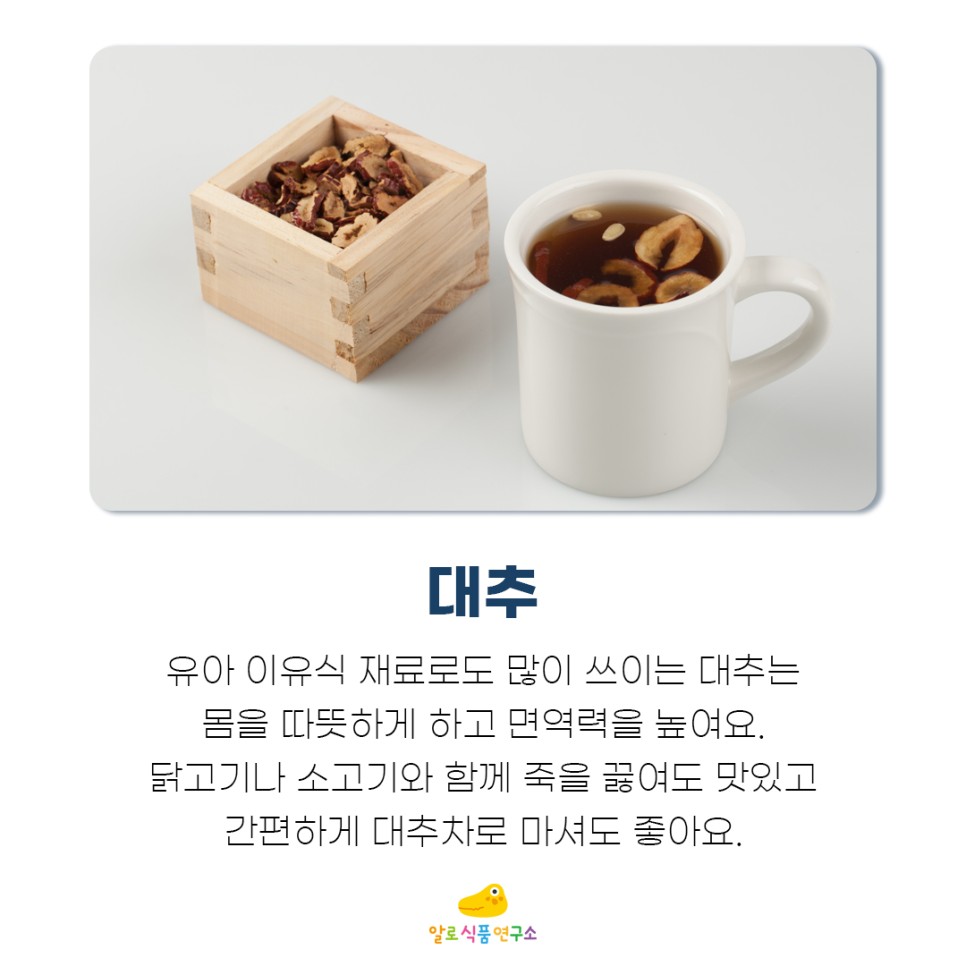 대추는 유아들의 이유식으로도 많이 쓰입니다.몸을 따뜻하게 하고 면역력을 키우는 데 도움이 됩니다.닭고기와 쇠고기와 함께 죽을 만들어도 맛있고 간편하게 대추차로 마셔도 좋습니다.