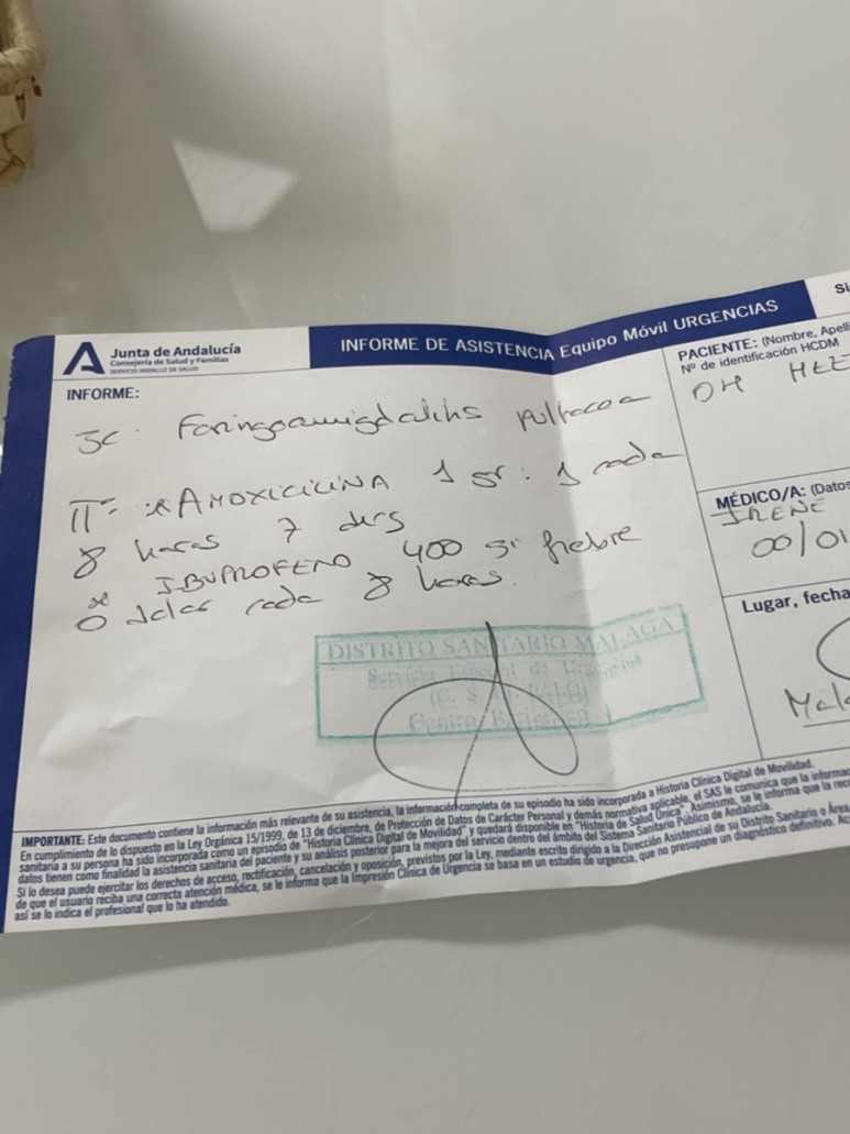 나는 아직 의료카드(Tarjetasanitaria였는지)도 없고 스페인어도 부족하지만 그래도 살기 위해 걸어서 6, 7분 거리에 있는 엘팔로 건강센터(El Palo Centrode Salud) 응급실에 갔다. 여권하나 가지고 (눈물) 솔직히 정말 맨살에 헤딩으로 해야 할 말은 마리아가 많이 도와줘서 메모장에 적어갔어!