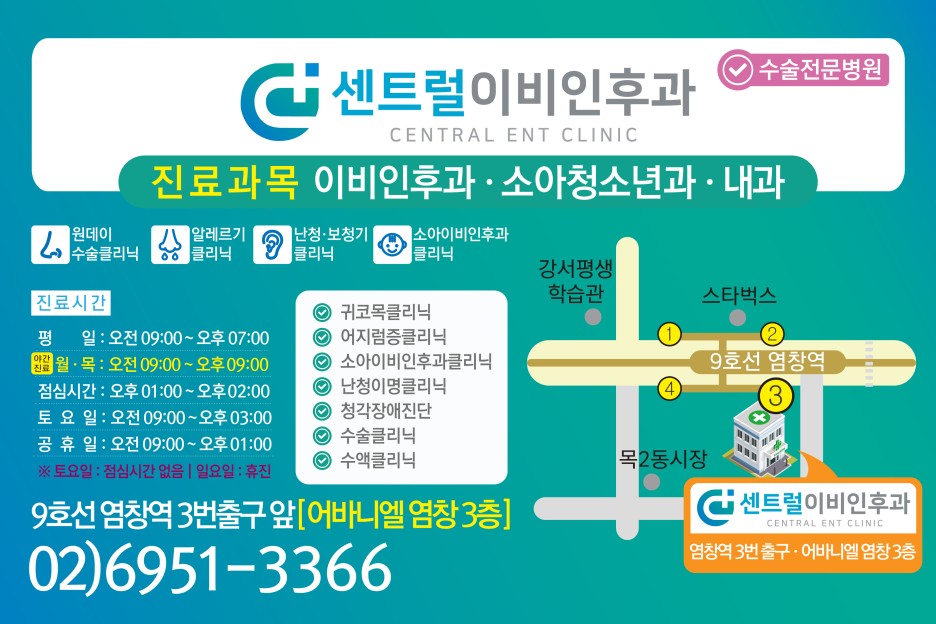 목동이비인후과는 9호선 염창역에 위치하고 있어 역에서 가깝기 때문에 처음 오시는 분도 편리하게 내원이 가능합니다. 또한 매주 월요일과 목요일에는 야간진료를 실시하고 있으니 편안한 마음으로 지원해 주시기 바랍니다.