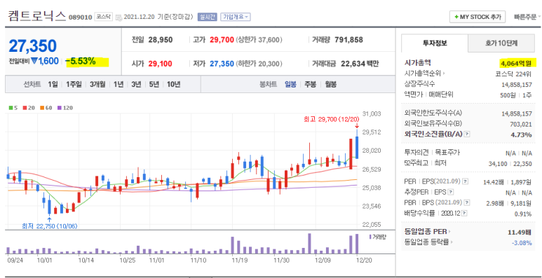 /워드 Electrification(전장화)의 약진이 두드러지고 있는데 내년에아래에서 좀 더 자세히 살펴볼 예정인 캠트로닉스라는 회사의 지난 1년여 차트에서 드러났듯이 지난해 말 뜨거웠던 주가는 올 들어 반년간 가격 조정을 거친 뒤 주급 60일선을 딛고 서서히 회복되는 모습이다.