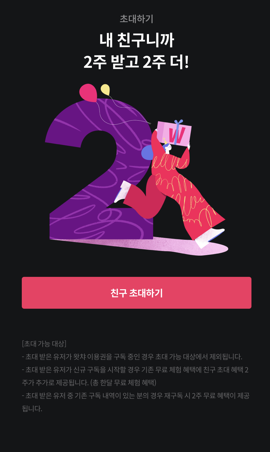 또한 “초대하기” 링크로 친구 초대 시 초대된 친구는 2주 동안 무료로 이용할 수 있는데 신규고객 기본 무료 2주 동안, 친구 초대 혜택 2주까지 총 4주 동안 무료로 와챠를 볼 수 있습니다!