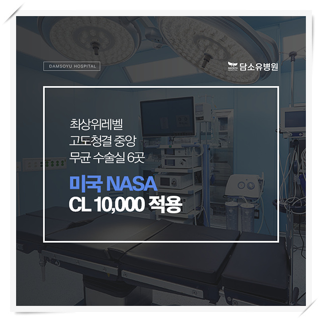 특히 본 병원은 9개의 외과 전문 의료기관으로 해당 질환 해결에 가장 적합한 곳이라 할 수 있습니다.수술실 단계는 미국 NASA의 바이오클린 규격 기준 CL10,000을 적용한 고도청결무균 수술실 6개를 보유하고 있습니다.