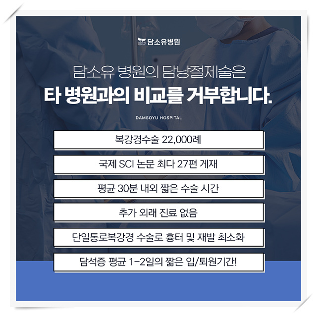특히 현재까지 단일 통로 복강 경담낭 절제술의 경우 4,037례 이상의 경험을 거친 곳으로 담석증명 의전문의가 집도하고 있어 합병증이나 재발의 위험 없이 안전하게 받으실 수 있습니다.