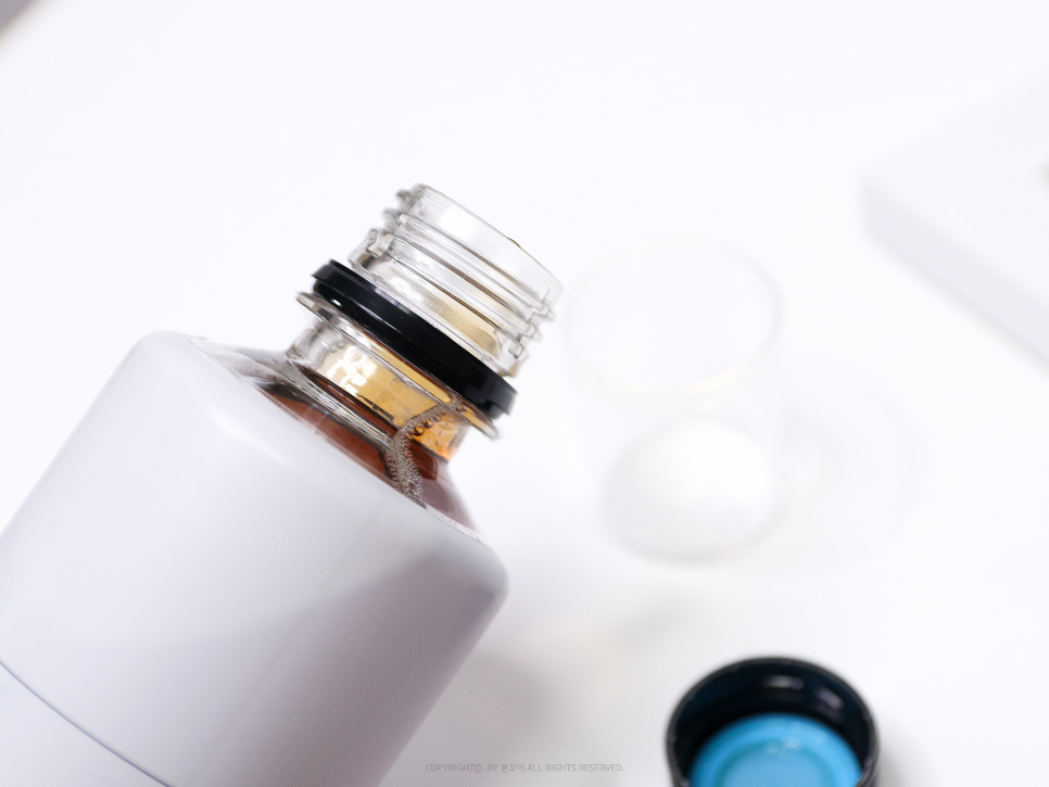 가글을 꺼내 쓸 수 있는 컵도 함께 들어있으니 한번에 10ml 정도를 부어 입에 넣어주세요.