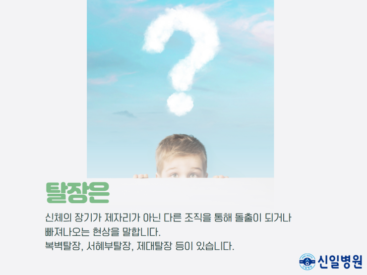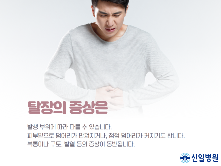 탈장이란 신체의 장기가 제자리에 있지 않고 다른 조직을 통해 돌출되거나 빠져나오는 현상을 말합니다.