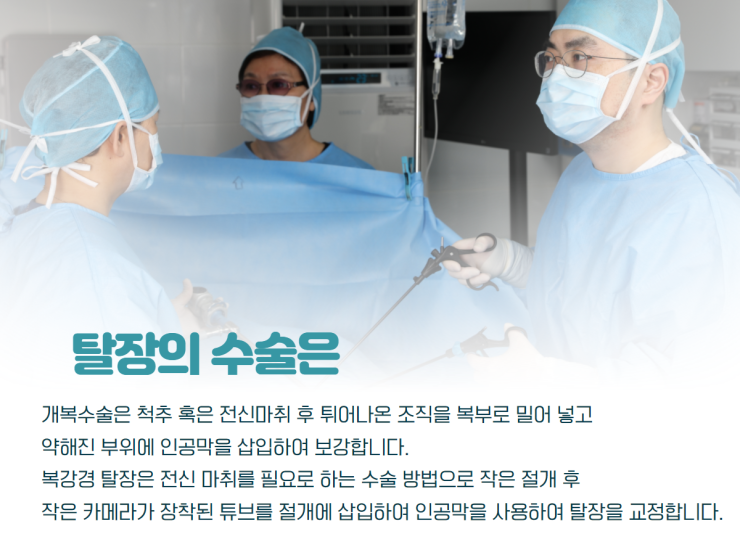 일반적으로 복강경으로 진행되면 흉터가 적어지고 빠르게 일상생활로의 복귀가 가능하며 개복수술보다 탈장수술의 입원기간이 짧습니다.