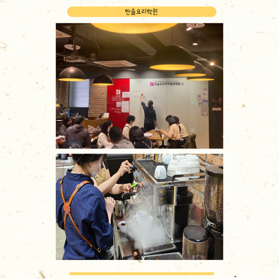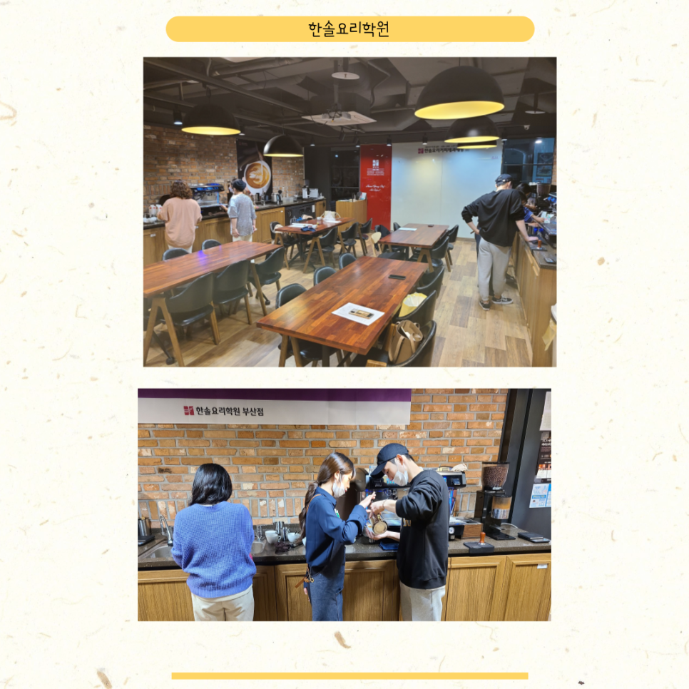 또 국비 지원이 가능한 곳이어서 내일 배울 카드를 통해 수강 등록을 해서 수강료 부담을 줄일 수 있었던 점도 매우 만족스러웠습니다. 그래서 부산바리스타학원에서 SCA과정부터 바로 들어보기로 했습니다. 1급이나 2급 과정을 먼저 배우는 것도 좋지만 어차피 배울 것, 국제자격증을 따고 싶었습니다. 보통 취미나 창업을 목표로 배우는 이 과정을 국내 대형 외식업체로 채용까지 지원하기 위해서 향후 포트폴리오 작성까지 입시 프로그램을 지원한다고 해서 단순 교육으로 수강을 끝내는 것이 아니라는 점에서 너무 좋았습니다