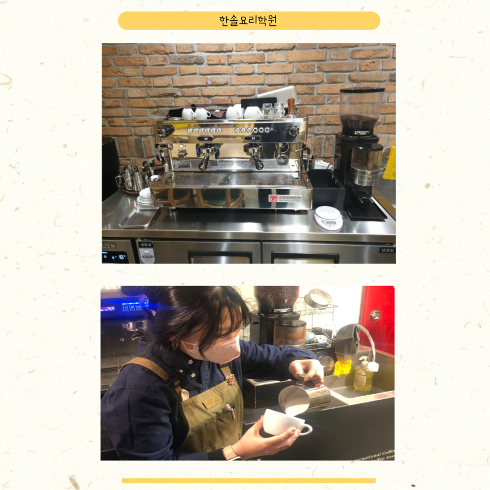 원두를 고루 펴서 압력만 주면 되는 줄 알았는데 어느 정도의 압력을 어떤 기술로 놓으면 일정한 맛의 에스프레소가 나오는지도 배웠고 그라인더 분쇄도 조절방법도 정교하게 배운 덕분에 잘게 분쇄하고 향미를 평가할 수 있을 정도의 실력도 키우게 되었습니다. 게다가 지금까지는 따뜻한 라떼 때 거품을 내기만 했거든요.