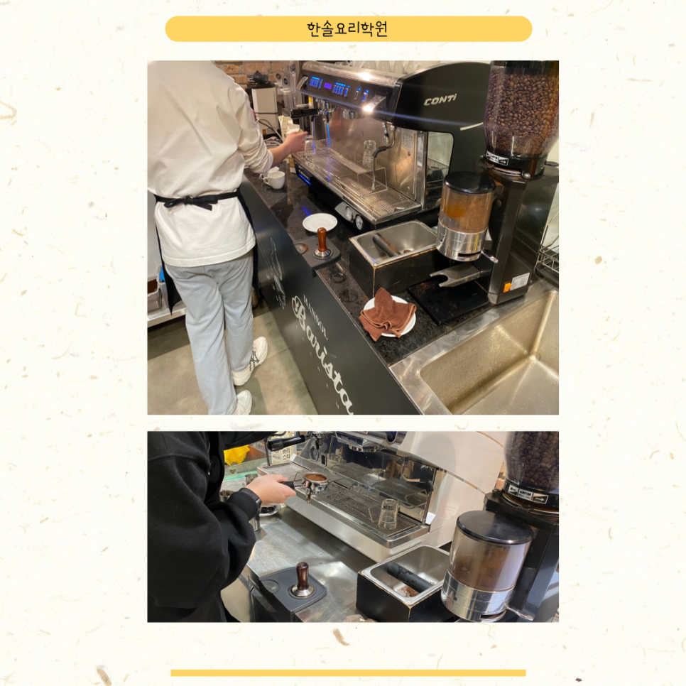 국내 자격증이 아니라 해외자 자격증이기 때문에 취득하는 과정이 좀 어려웠습니다. 다행히 부산바리스타학원에는 시험용 전용머신과 그라인더가 보유되어 있어 실기시험에 대비하여 개인적으로 연습할 수 있도록 1인 머신을 독점 활용할 수 있게 해주셔서 충분한 연습을 하는데도 도움이 되었습니다. 저는카페아르바이트를해본경험이있어서커피를충분히잘알고있다고생각했지만역시전문교육기관에서배우면아니거든요. 카페에서 일을 배울 때는 커피 생산이나 에스프레소의 올바른 도딩 방법, 레벨링, 템핑에 대해서 제대로 기술을 배워본 적이 없었어요.