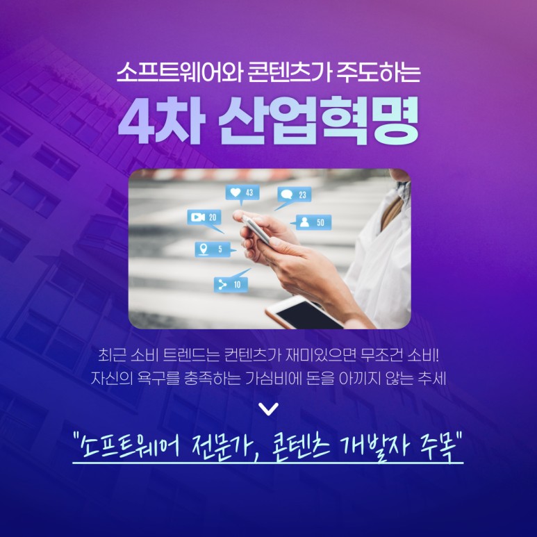 요즘 소비자들의 소비 트렌드는 ‘콘텐츠가 재미있으면 무조건 소비’가 트렌드가 됐어요. 그만큼 자신의 욕구를 충족시키는 가심비에 돈을 아끼지 않는 편입니다. 그래서 꾸준히 각광받는 소프트웨어 전문가와 콘텐츠 개발자들은 항상 각광받는 현재/미래희망 진로 중 하나가 아닐까요?