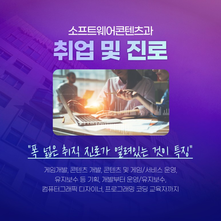소프트웨어콘텐츠과는 운영중인 교과과정이 개발, 디자인, 마케팅, 데이터 운용 등 폭넓게 취득 가능한 자격증도 개발에서 디자인까지 다양하고 졸업 후 취업진로도 넓은 편입니다. 유니티 Certification과 OCJP의 경우 국내 대형 게임 개발사는 물론 웹/앱 서비스를 운영하고 있는 서비스업체 취업도 가능합니다. 게임 개발, 콘텐츠 개발, 콘텐츠 및 게임/서비스 운영, 유지보수 등 기획, 개발에서 운영/유지보수까지 폭넓은 취업진로가 열려 있는 것이 특징입니다.