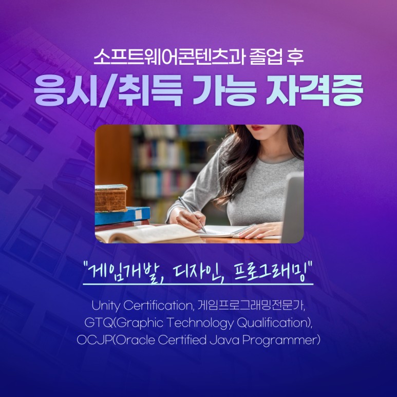 소프트웨어콘텐츠과를졸업후응시,취득가능자격증UnityCertification,게임프로그래밍전문가,GTQ(GraphicTechnologyQualification),OCJP(OracleCertifiedJavaProgrammer)