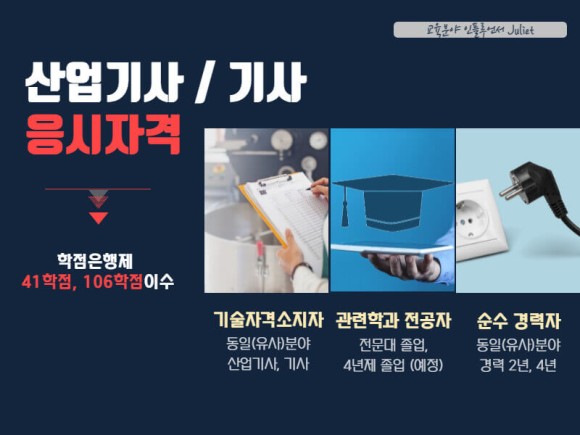 [기사응시자격] 1. 해당 전공 4년제 대학 졸업(예정)자 2. 해당 분야 경력 5년 이상 3. 유사 분야 기사 소지 4. 학점은행제 106학점 이수
