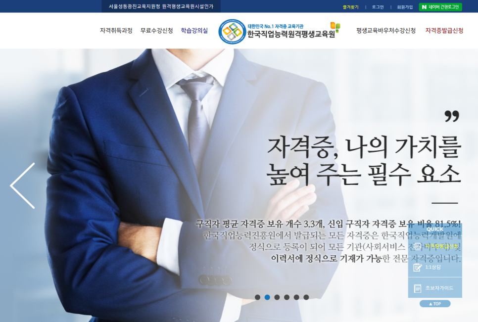 신뢰할 수 있는 유망 전문 자격증 취득을 목표로 한국직업능력진흥원 사이트를 방문하였습니다먼저, 이 사이트의 가입은 네이버 연동 등록이 가능하여 매우 쉽고 편하게 가입하며, 회원 가입 시 전체 강좌 80과목 중 최대 3과정을 무료로 수강할 수 있습니다.