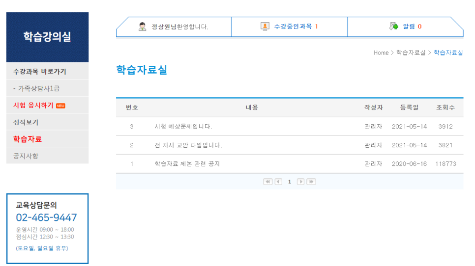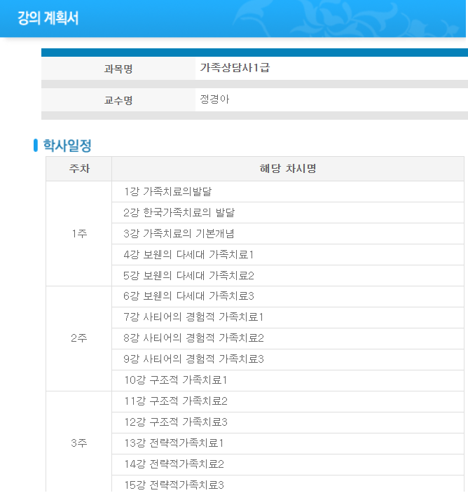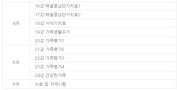 제가수강했던가족상담사1급은총24강으로되어있어서하루를정해서강의를한꺼번에다듣고,시험은하루쉬고학습강의실에시험예상문제가있는데이것을한번보고어렵지않게합격