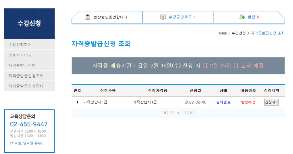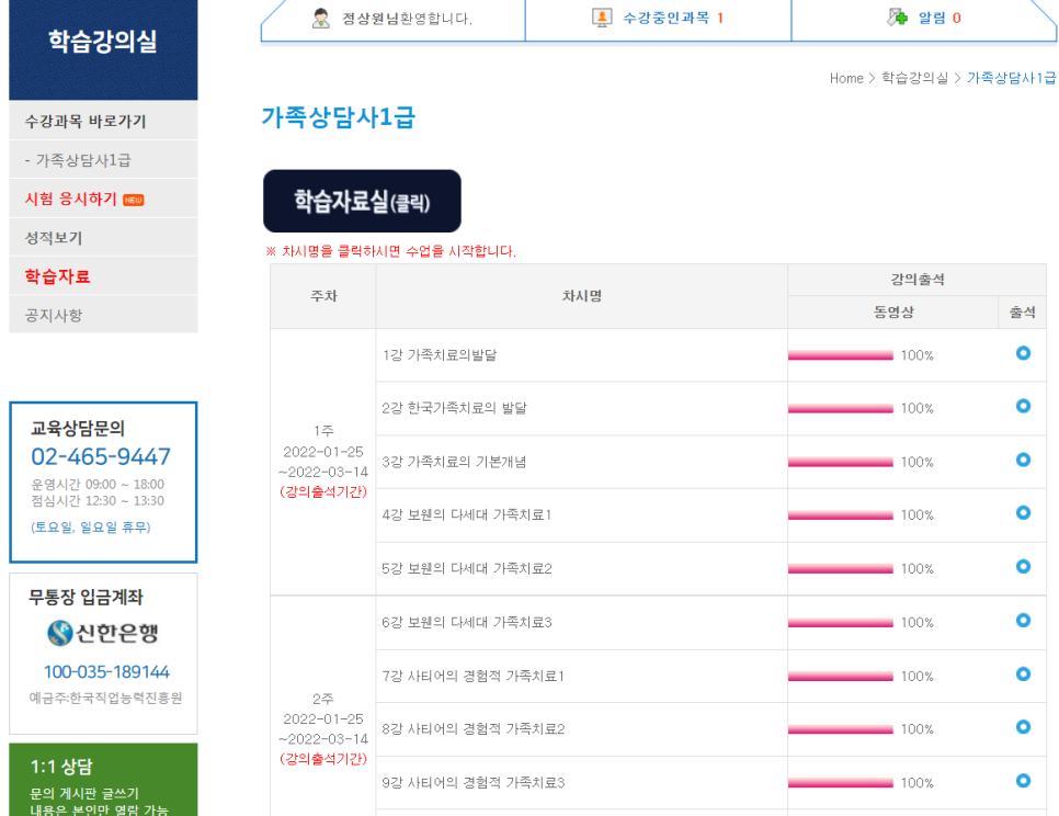 일단 제 소개를 하자면 대학원에서 사회복지학을 전공하고 사회복지사 2급을 취득했고요.그리고 심리상담사 1급, 1월에 취득했고 2월 목표자격증 하나 다 취득하려고 가족상담사 1급을 최단기에 합격한 것 같아요. 인터넷 강의로 보고 인터넷으로 시험을 보면 되니까 한번 더 해보면 쉽게 취득이 가능하고 하나 더 취득하려고