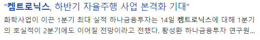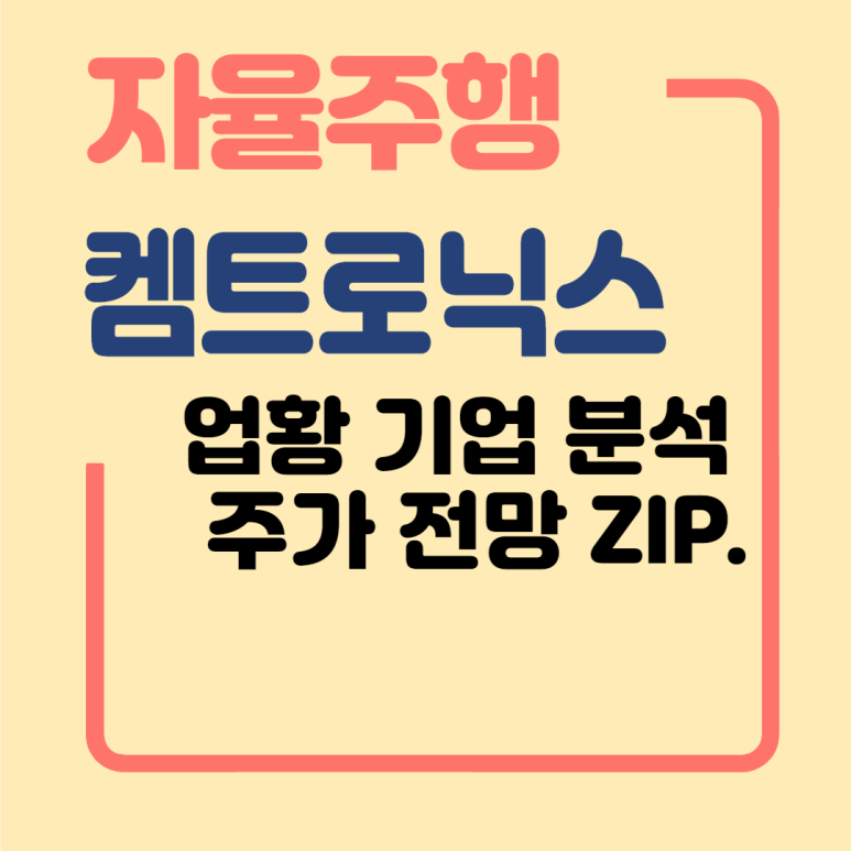 안녕하세요. 오늘은 자율주행 자동차 관련주 캠트로닉스 투자 포인트 및 주가 전망에 대해 말씀드리겠습니다.