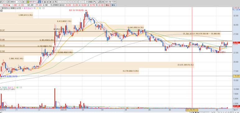 켐트로닉스는 화학산업도 영위하고 있습니다. PMA를 판매하고 있지만, 제품 부족이 계속되고 있습니다. PMA는 최고급 페인트, 반도체 및 디스플레이 필수 공정에 사용되는 제품입니다. 판매가격의 상승으로 수익성의 개선효과를 얻을 수 있다고 판단하고 있습니다. 또한, PMA는 기존의 전량 수입에 의존하고 있었기 때문에 PMA의 국산화에 따른 혜택을 받을 것으로 기대됩니다. 삼성전자와 삼성SDI의 납품을 목표로 하반기 관련 설비를 증설합니다. 1년 내 양산될 것으로 기대하면서 공급 규모 확대에 따른 매출 성장 기대감도 나타나고 있습니다.켐트로닉스 차트