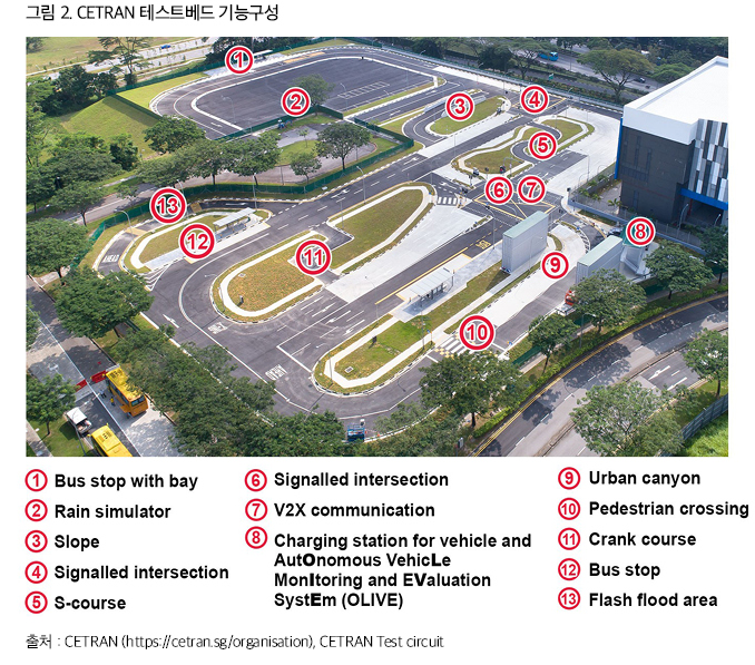 싱가포르 CETRAN은 남양공대에 인접한 클린테크파크(Clean Tech Park) 내에 위치하며 약 20.000㎡ 면적에 횡단보도와 교통표지판을 설치하여 시가지 도로와 빗물 시뮬레이터를 구현 운영하고 있습니다.CETRAN에 인접한 남양공대 내부 도로에도 자율주행 및 C-ITS 관련 인프라를 구축해 테스트베드 실험 후 실도로에서도 실험이 가능한 환경을 제공하고 자율주행을 위한 종합실험 환경을 제공하고 있습니다.
