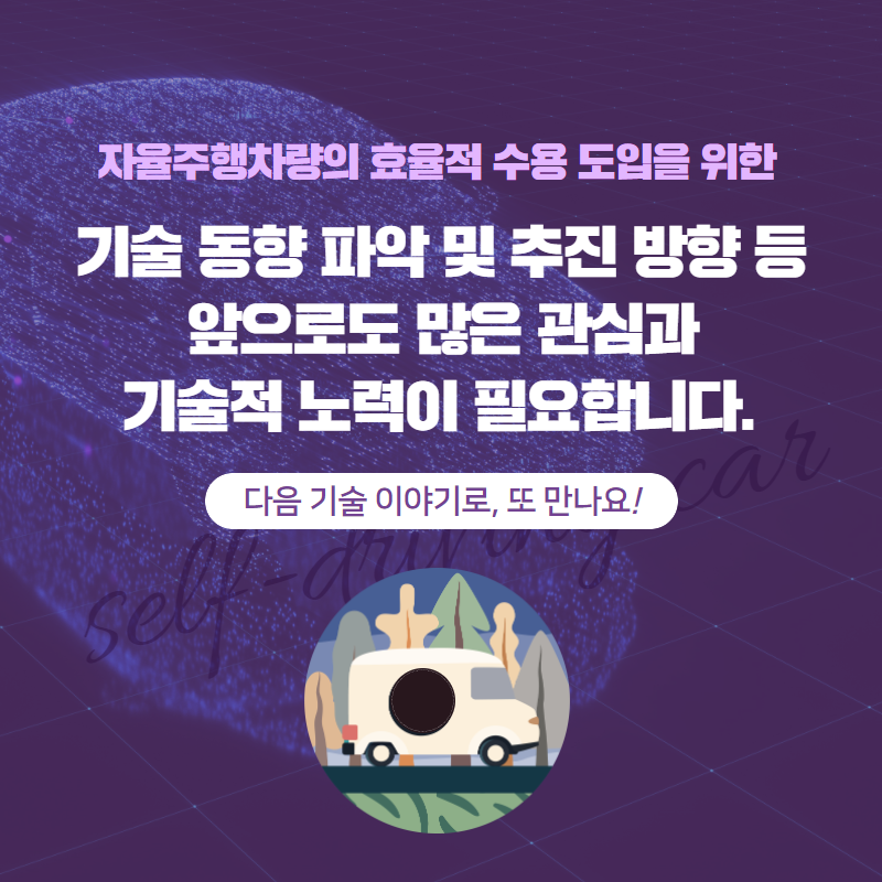 ※ 서울기술연구원 정기간행물-21년 서울기술연구 여름호 <안심공간, 서울> ▷ 자율주행차 실증환경 조성 추진 동향 및 서울시 발전방안 ※ 참고문헌[1] 2020년 AVRI 1위국으로 선정, KPMG International, 2020.[2] 2016년도 자동차안전연구원 연차보고서, TS교통안전공단 자동차안전연구원, 2017.[3] 이항구, 윤자연, 전기동력/자율주행 자동차산업 현황 및 전망, 산업연구원, 2018.[4] 자율주행기업 지원속도 내기/혁신성장센터 착공, 국토교통부 2020.06.19.