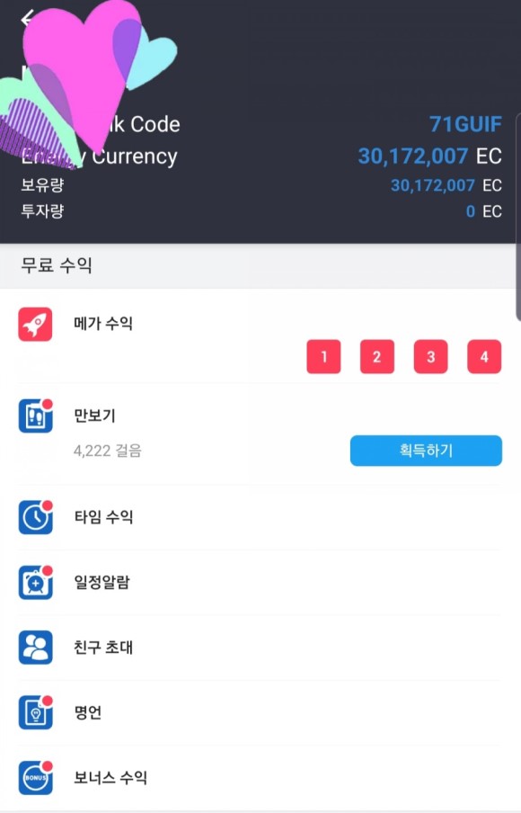 무료수익은 위의 사진처럼 만보기, 타임수익, 메가수익 등 주로 광고를 보거나 일정을 등록하거나 만보기를 누르거나… 등등 단순 클릭으로 얻는 수익-