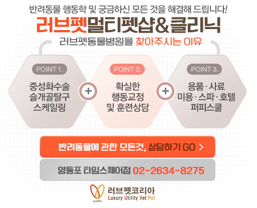 소중한 반려견의 행동교정은 모티론, 응급, 진료, 수술, 미용, 유치원, 건강까지 관리해 드립니다.믿을 수 있는 동물 전문 클리닉 러브펫 병원 영등포 타임스퀘어!