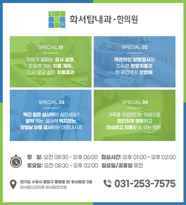 객관적인 서양검사와 익숙한 한방치료를 한 공간에서 한꺼번에 치료하는 화서탑 내과 한의원은 내 가족을 치료한다는 마음으로 정직하게 진료하고 있습니다.