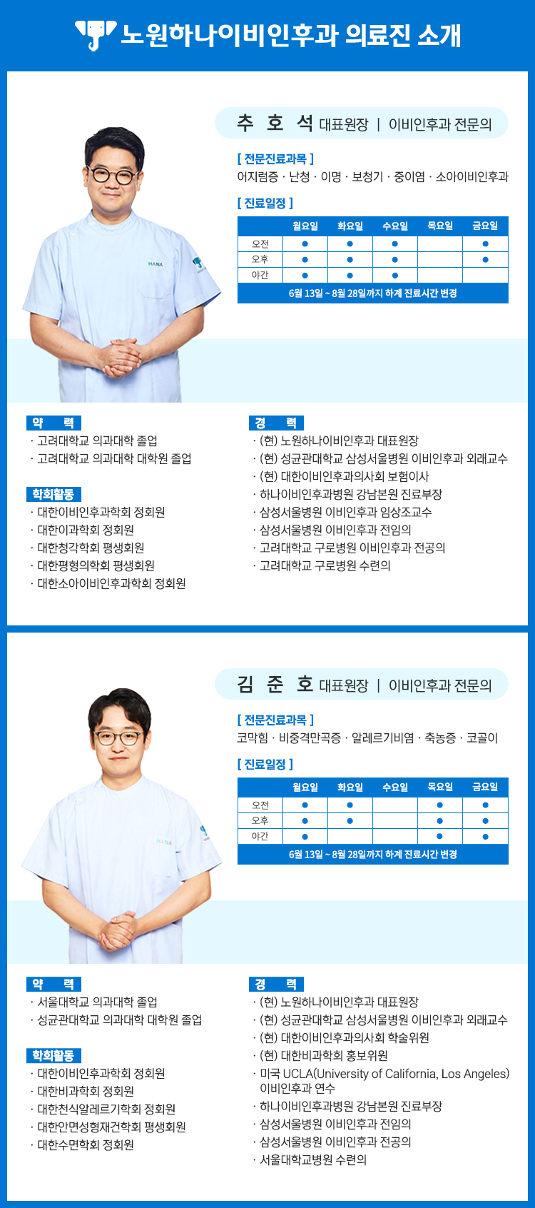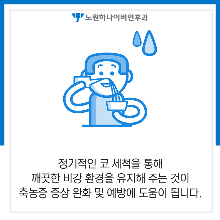 마지막으로 생활 속에서 할 수 있는 축농증의 증상 완화 및 예방법에 대해 알려드립니다. 가장 효과적인 방법은 정기적으로 코 세척입니다. 축농증은 재발이 많은 질환이므로 정기적인 코 세척을 통해 꾸준한 관리를 하는 것이 좋습니다. 하지만 근본적인 치료방법은 아니므로 확실한 치료를 원하신다면 노원축농증병원, 본원 하나이비인후과에 내원하시기 바랍니다. 저희 노원하나이비인후과는 7호선 노원역 6번출구 바로 앞 KB국민은행 빌딩 5층에 위치하고 있습니다. 상담 및 문의사항은 02)952-8883 으로 답변드립니다. 노원하나이비인후과 홈페이지에 들어가시면 보다 자세한 내용을 확인하실 수 있습니다. 더 자세한 사항은 하단의 배너를 클릭하여 노원하나이비인후과 홈페이지에서 확인하시기 바랍니다. ^^