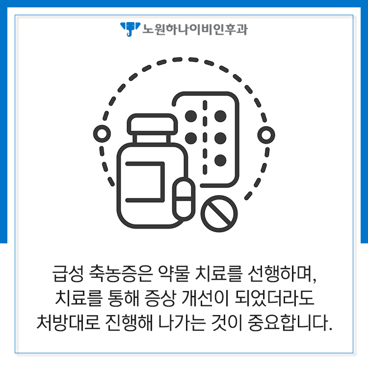 급성 축농증은 감기 때문에 시작하는 경우가 많아 조기에 치료할 경우 빠른 치료 효과를 기대할 수 있는데요. 급성 축농증의 경우 약물치료를 선행하게 됩니다. 염증을 가라앉히기 위한 항생제, 소염진통제, 비충혈완화제, 비강 내 스프레이 처방으로 치료합니다. 여기서 주의할 점은 약물치료로 인해 증상이 개선되더라도 임의로 중단해서는 안 된다는 점입니다. 염증이 사라지고 회복하려면 시간이 걸리기 때문에 처방에 따라 치료를 진행하는 것이 필요합니다.