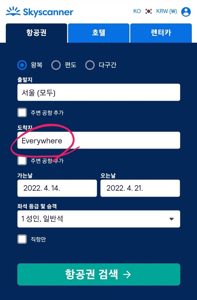 3. 아래 skyscanner 화면에서 everywhere 되어있는 것을 클릭하여 돌립니다.