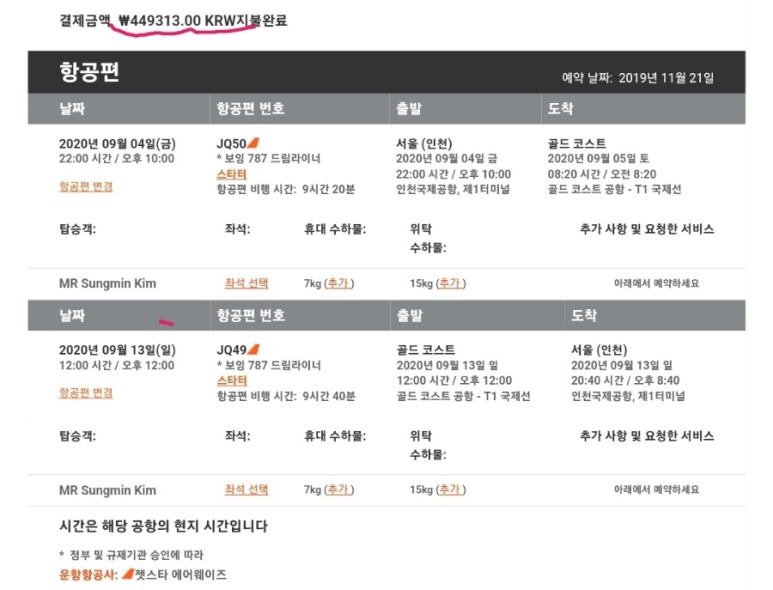 코로나 이전에 끊었던 호주 골드코스트 직항 449313원 (코로나로 인해 취소)