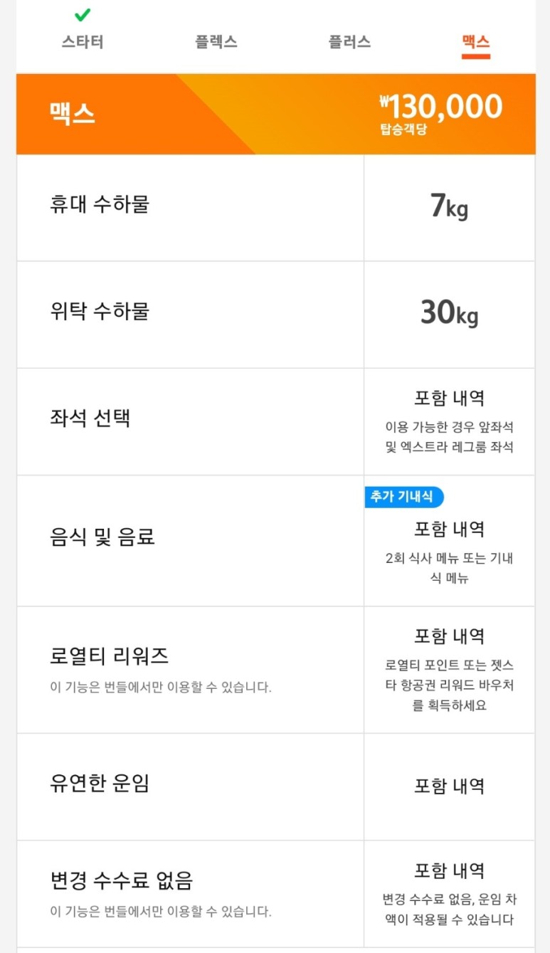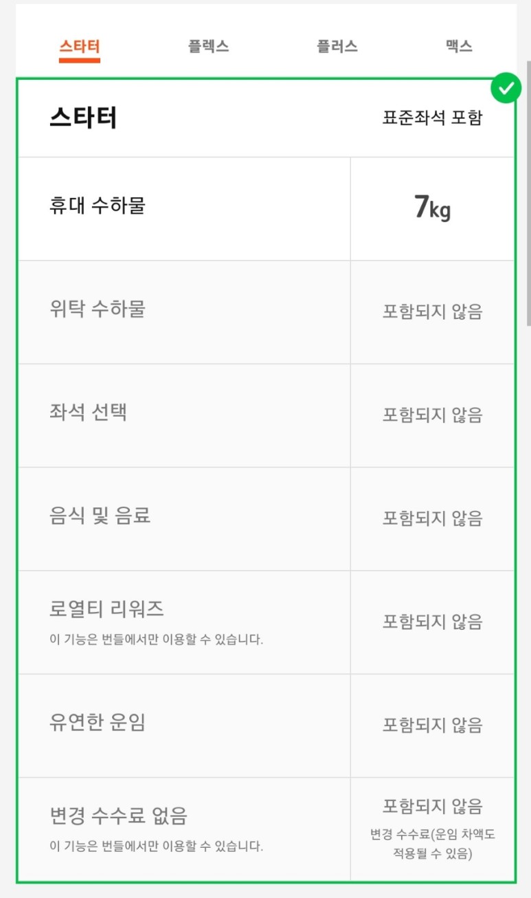 기본 8542원에는 기내식도 포함하지 않고 수하물도 보낼 일 없이 기내 수하물만 7kg이라 카메라를 들고 다니는 저로서는 이용이 어려울 것 같아 추가하였습니다.