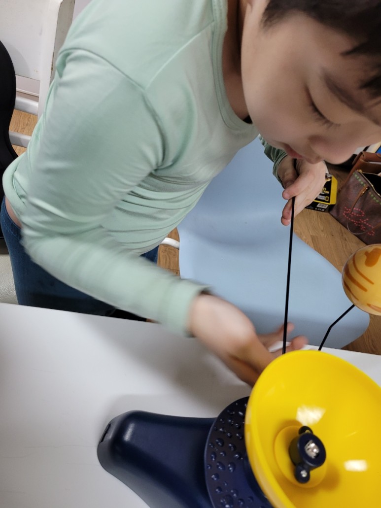 특별한 자리나 순서는 없습니다. 아이가 조립하다가 중간에 마음대로 끼워 넣었는데 다 잘 맞았어요.조립을 마치고 아주 만족스럽게 작동해 봤어요.일렬로 행성을 모아 회전을 작동시켜 보니 막대기 길이가 짧은 것부터 빨리 돈다고 해서 어떤 과학적인 것을 발견한 것처럼 기뻐했습니다.
