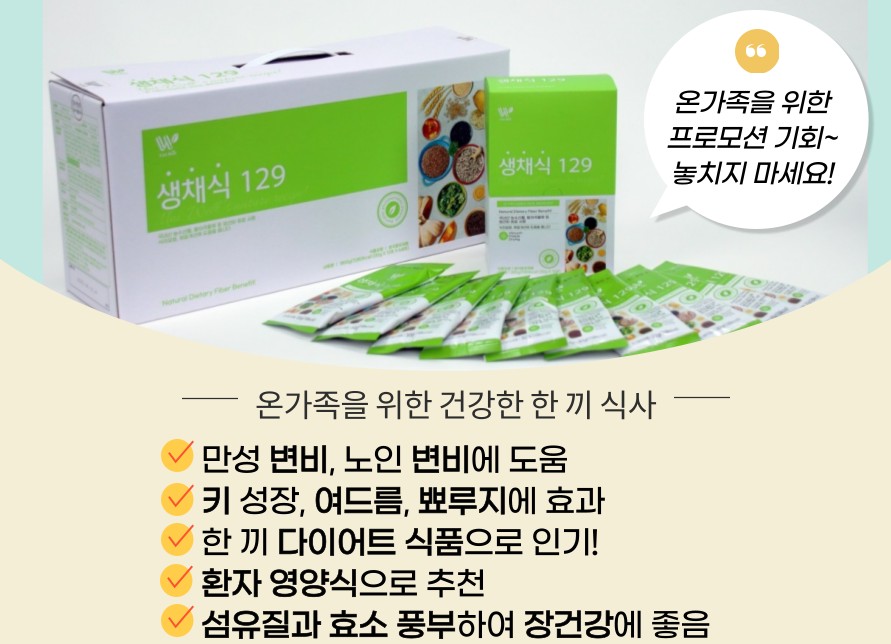 이들 환자는 아침식사로 현미 종목, 곡물류, 해조류, 채소류 등이 포함된 생식을 섭취하게 한 결과 체중이 평균 1.3kg, 체지방률이 1.5% 감소했고 총 콜레스테롤 수치도 2% 각각 감소했다.