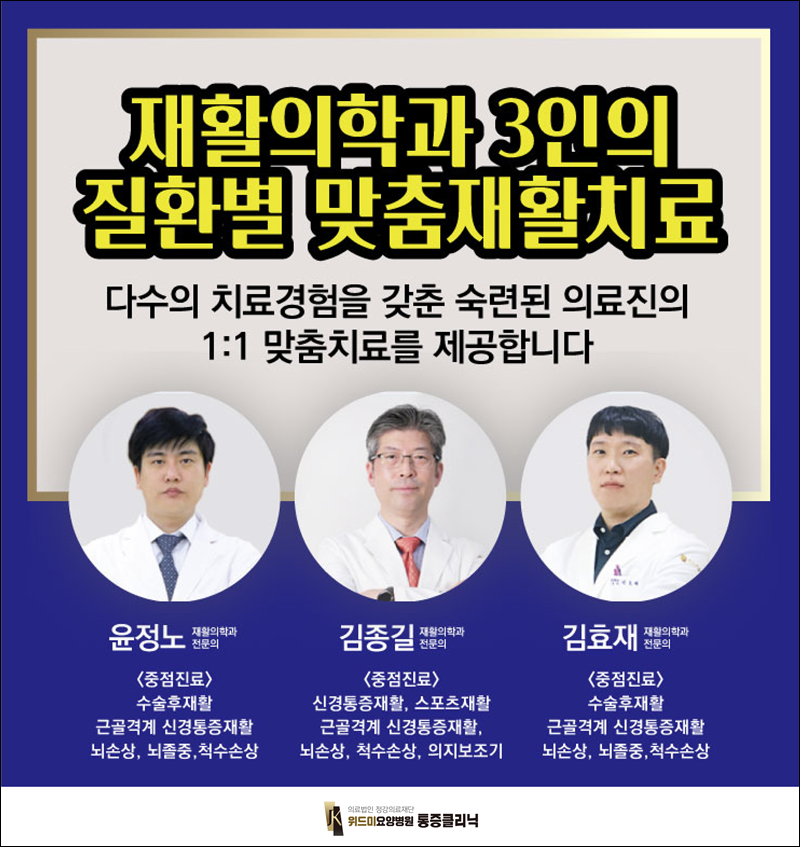 풍부한 경험과 노하우를 갖춘 3명의 재활의학과 전문의가 1:1 맞춤 진료를 진행하여 보다 꼼꼼한 상담이 가능합니다.