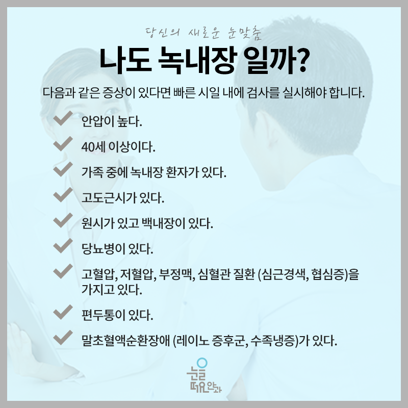 40~50대 녹내장 원인과 증상 및 치료를 알아보는 서울특별시 서초구 서초대로77길 55 에이프로스퀘어12층 깨우는 치료과 #40대 #50대 #녹내장 #원인 #증상 #치료