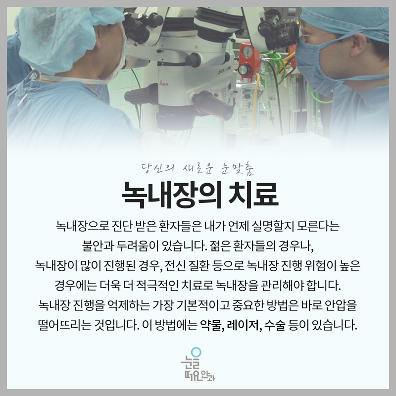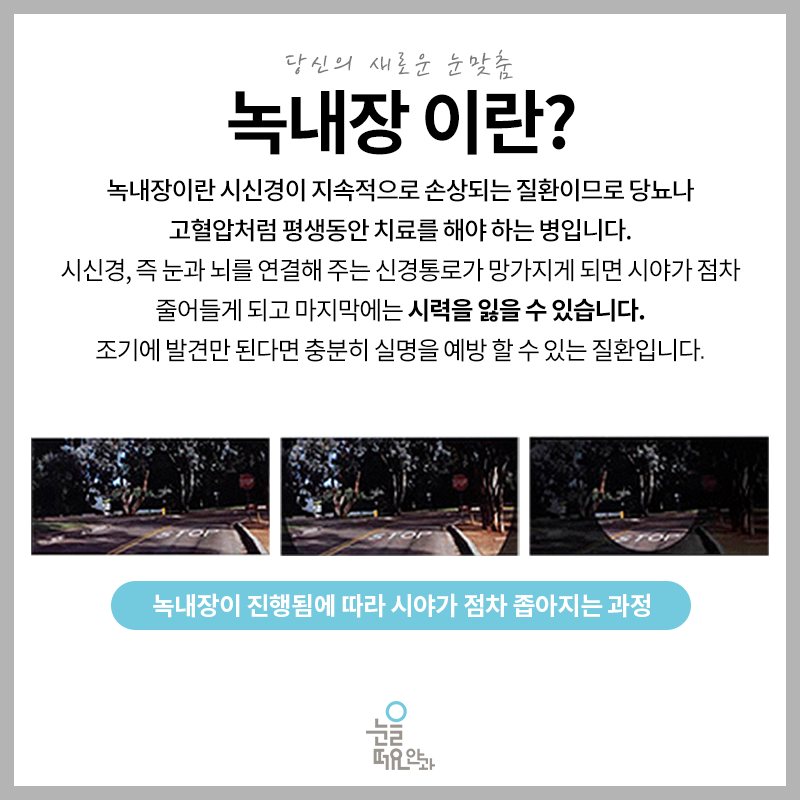 우리 신체기관에서 나타나고 있는 여러 가지 문제들은 그에 걸맞은 원인을 가지고 있었습니다. 어디 하나라도 빠짐없이 중요한 기능을 하고 있기 때문에 평소에 잘 관리해주는 것이 중요했습니다. 특히 눈의 경우는 자는 시간을 제외하고 지속적으로 이용하고 있기 때문에 보다 잘 관리하고 어떤 문제가 발생했을 때 초기 대처를 하는 것이 중요합니다. 녹내장은 시신경에 손상이 발생함에 따라 나타날 수 있고 그것이 결국 실명으로까지 발전할 수 있기 때문에 적극적으로 관리해 줄 필요성이 있었습니다.