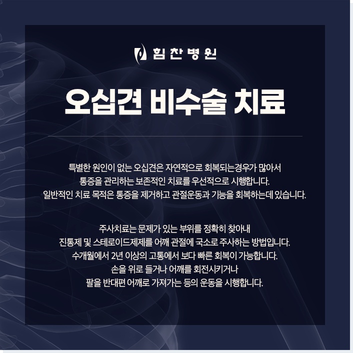 자연치유는 가능하지만 그 기간이 길고 그 사이 증상이 악화돼 일상생활까지 어려워지는 경우가 많았습니다. 가급적 방치하지 말고 오십견 치료방법을 통해 어깨 건강을 회복해 볼 것을 권장하였습니다. 평소 어깨 질환을 예방할 수 있는 방법을 알아두고 실천해 주시는 것도 중요했습니다.
