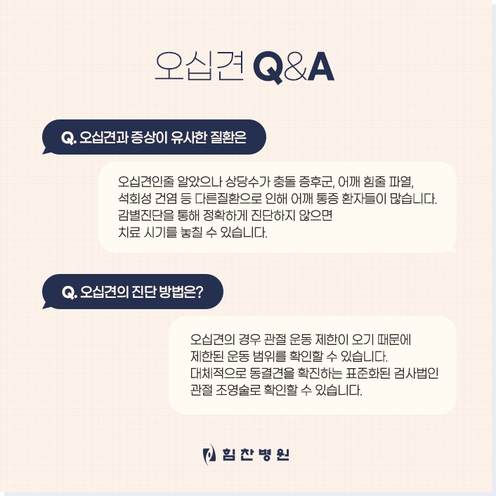 대부분의 사람들은 초반에 가벼운 증상이라고 생각하고 간과하는 경우가 많았습니다. 시간이 지나면 나아질 거라고 믿고 내버려두는 분들도 적지 않았습니다. 하지만 자신에게 나타나는 문제나 질환을 치료하지 않고 방치하게 된다면 앞으로도 통증에 시달릴 수밖에 없었습니다. 예전에는 잘 움직여 위로 올라가던 팔의 움직임이 제한되고 통증을 느끼면 다음에는 식사 때 숟가락을 드는 것조차 어려워질 수 있었습니다.