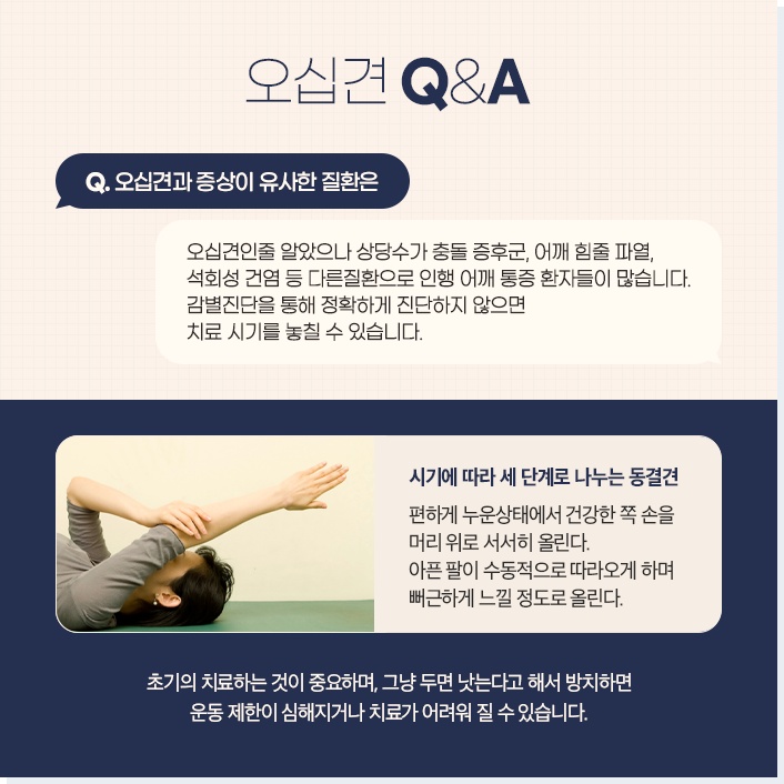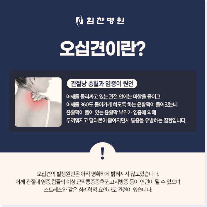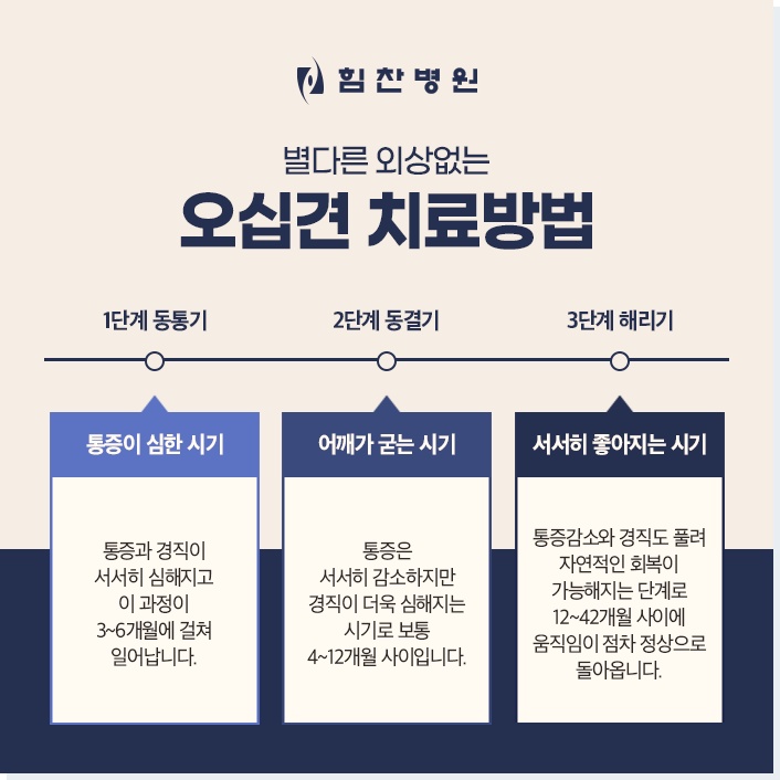 나이가 어리다고 오십견이라고 생각하지 않고 방치하면 오랜 기간 겪은 통증으로 인해 생긴 후유증으로 관절운동에 제한이 남아 운동장애로 이어지기도 했습니다. 오십견은 외상이나 충격을 받지 않고도 발생할 수 있는 질환으로 어깨 관절을 둘러싼 조직에 염증이나 유착이 되는 증상을 말합니다. 동결견 유착성 관절낭염이라고 불리며, 보통 3단계에 걸쳐 나타나는 것으로 알려져 있었습니다. 첫 번째 통증기에는 통증이 나타나고 점점 더 심해지는 과정이었습니다. 통증으로 어깨를 적게 사용하면 어깨가 굳어지는 상태가 될 수 있었습니다.